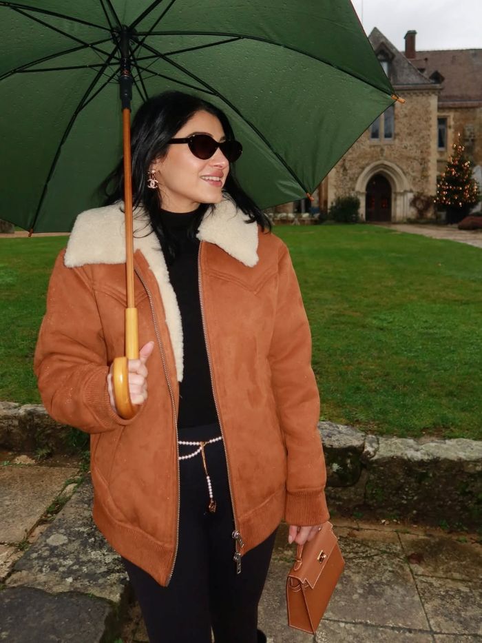 У Анны Карапетян - пример так называемого quiet confidence look. Здесь нет резких акцентов, но есть сильная структура. Дублёнка STAND STUDIO задаёт объём и фактуру, чёрная база вытягивает силуэт, а сапоги в конном стиле добавляют аристократичную строгость. Hermès Kelly Pochette звучит очень деликатно - как элемент вкуса, а не демонстрации.