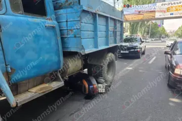 Երևանում մոտոցիկլի և բեռնատարի բախման հետևանքով մոտոցիկլը հայտնվել է «ԶԻԼ» բեռնա...