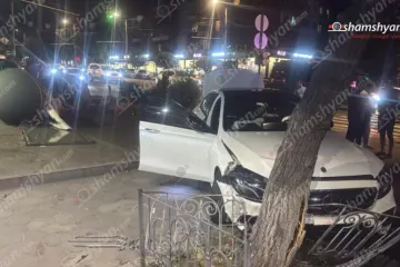 Երևանում «Mercedes»-ը կոտրել է գովազդային ցուցանակը, բախվել ծառին