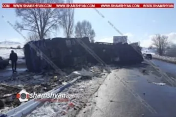 Խոշոր ավտովթար Սևանի գաղութի մոտ. 20 տոննա «Ռոշեն» կոնֆետով բարձված բեռնատարը կողաշրջվել է
